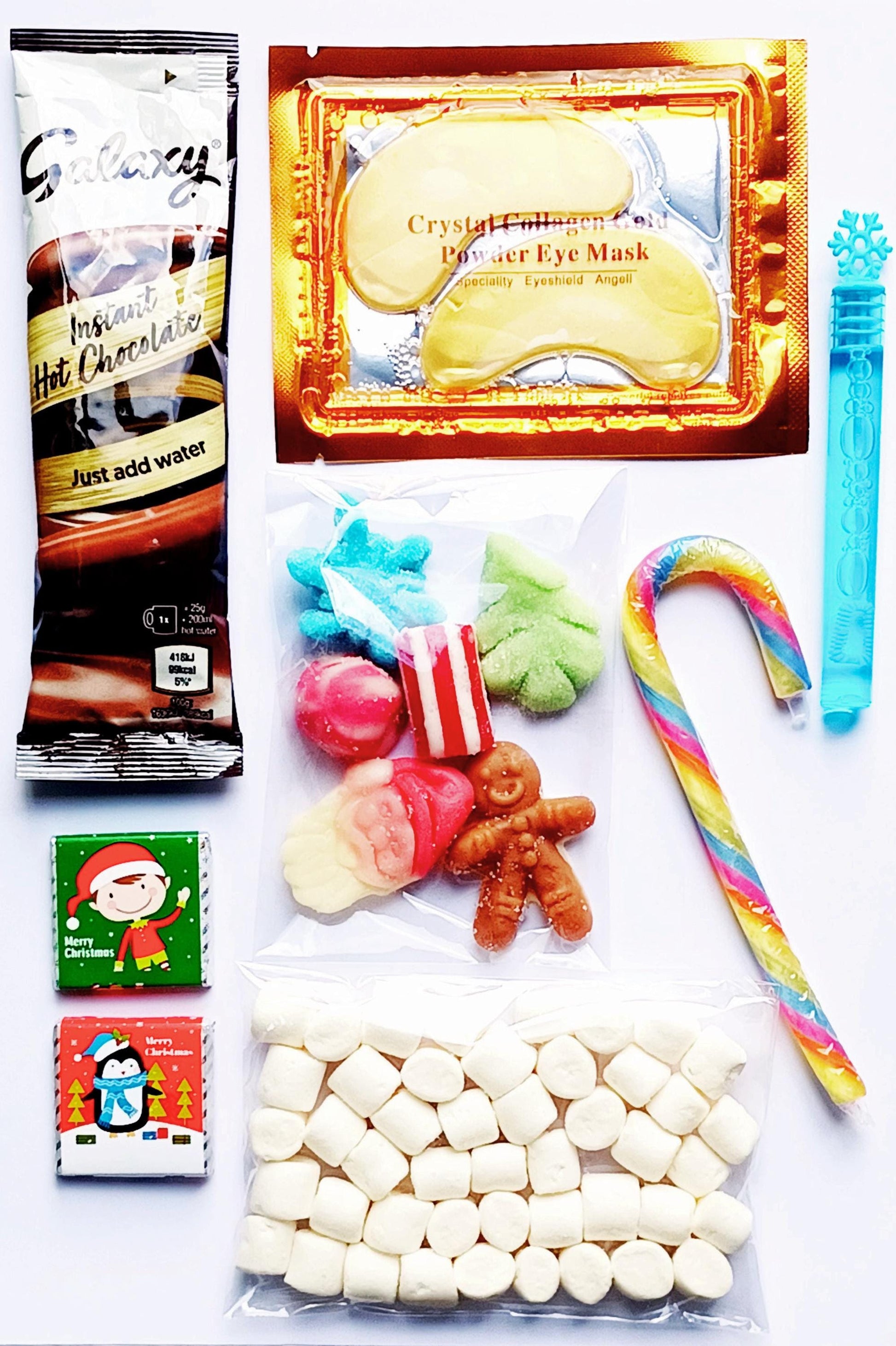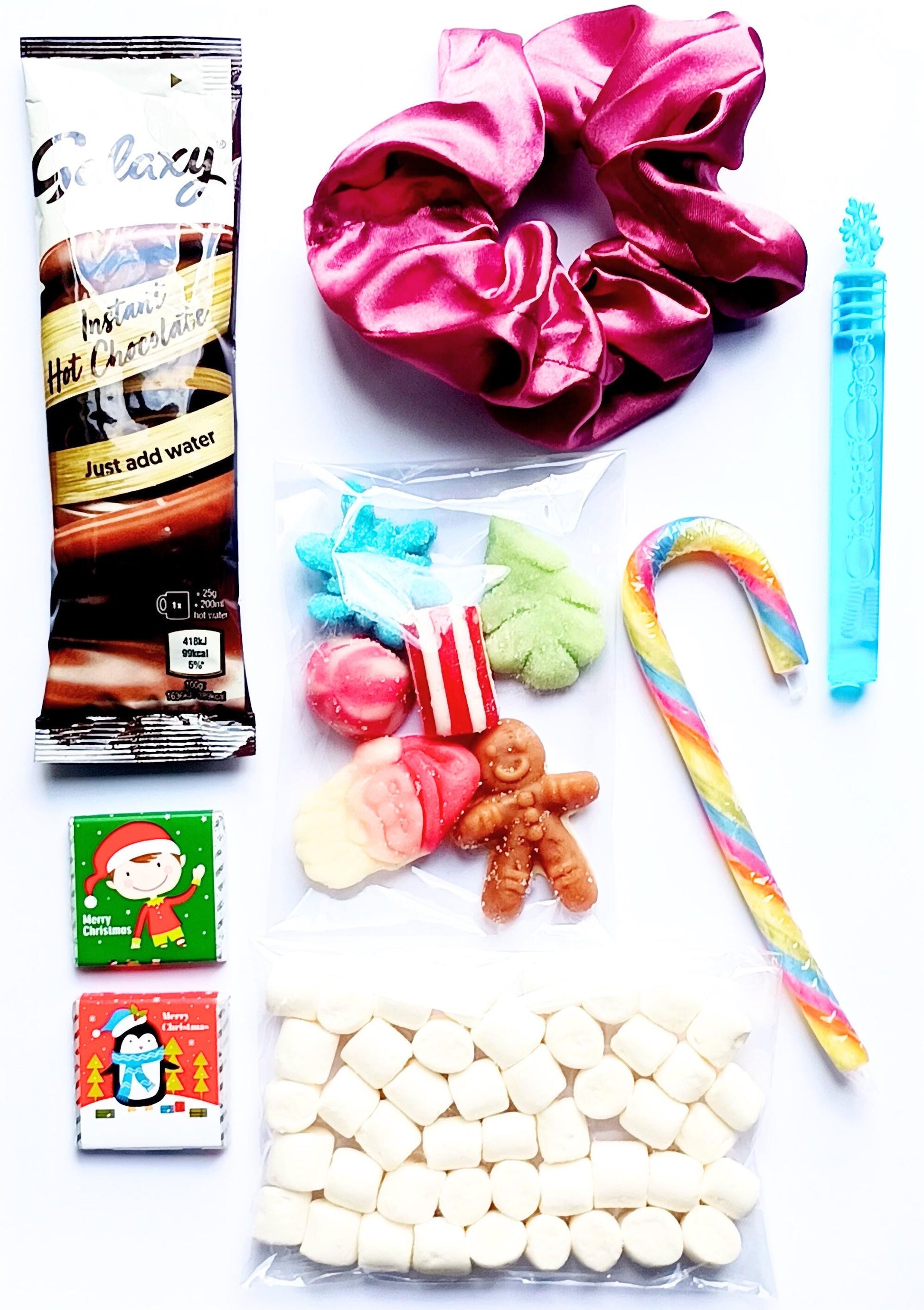 1 x 15g hot chocolate sachet, Mini marshmallows (All are halal certified), Small bag of festive sweets, 1 x Candy cane, 2 x Chocolate pieces, Small festive bubble tube, Small festive gift (please select gift option).