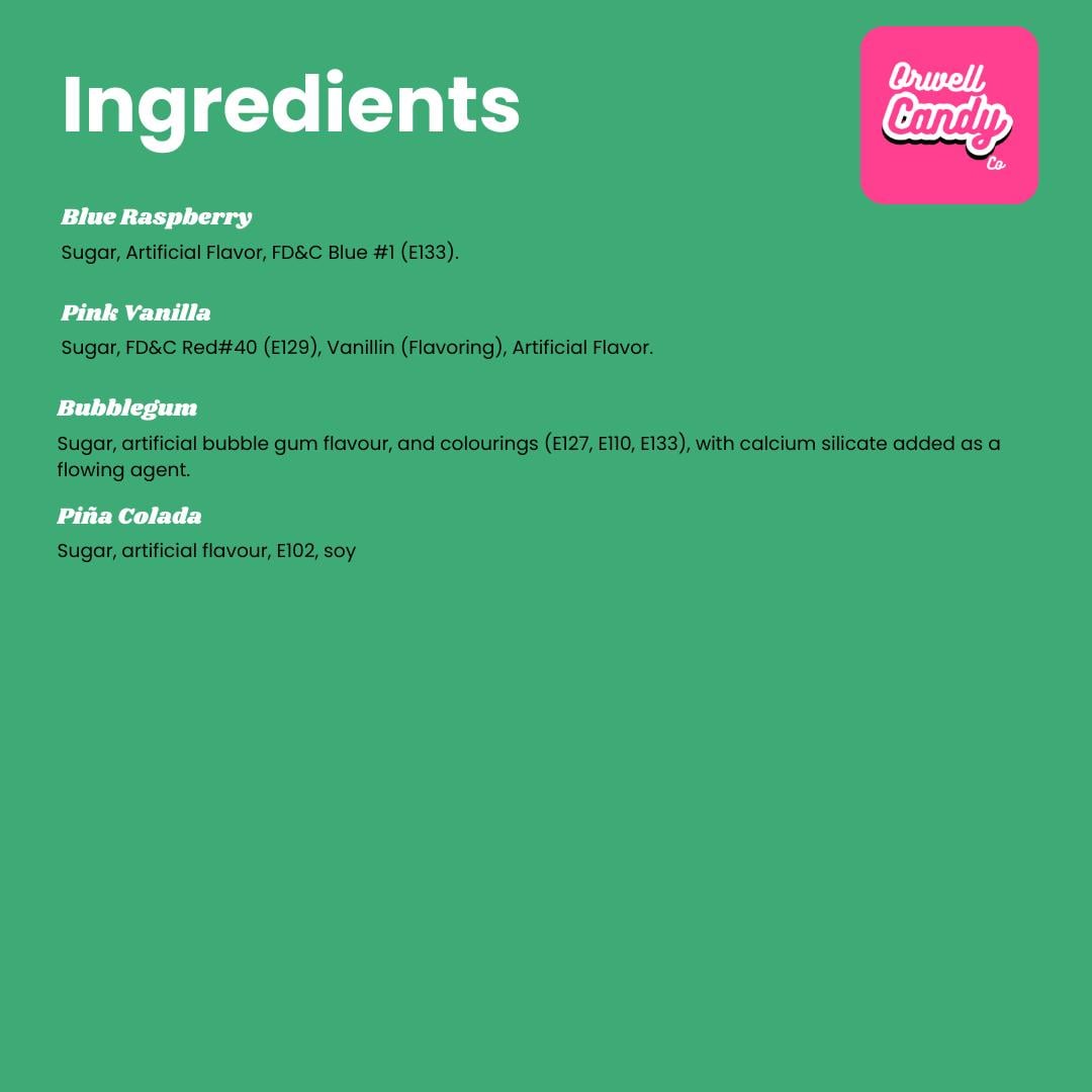 Allergy advice: Candy floss is made from sugar and may contain flavourings, colourings, and additives. Produced in an environment that may handle nuts, milk, soya, and gluten. Please see images for ingredient listings.